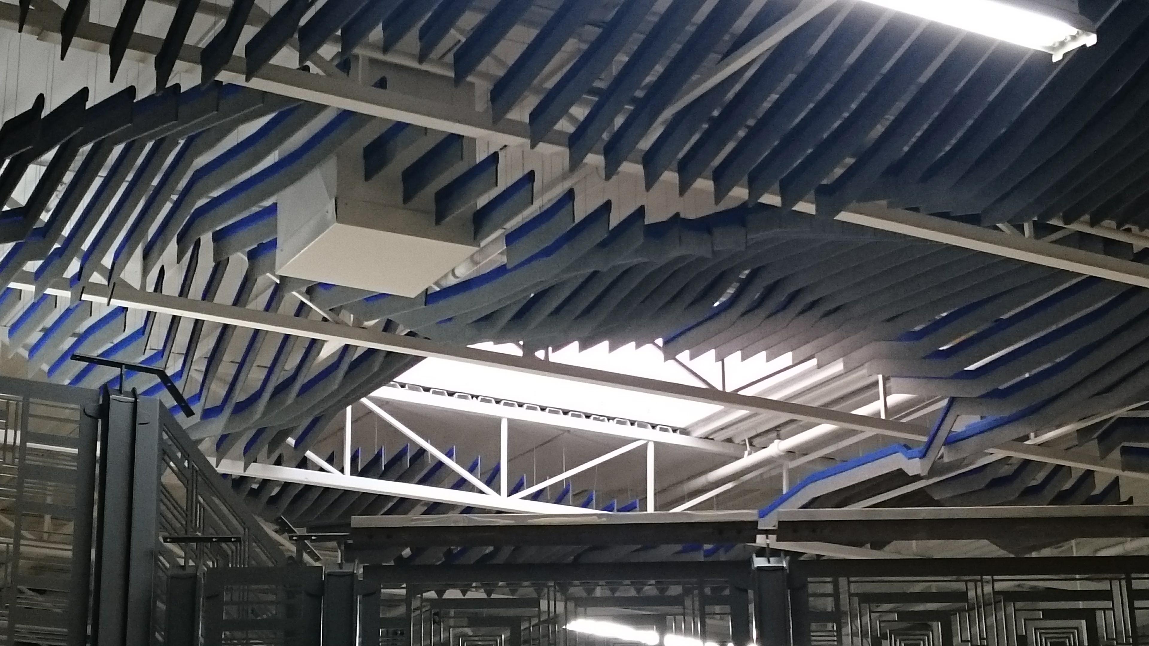 This custom Straight Baffle system cuts and curves through the ceiling’s varied geometry. The open deck never looked so good.