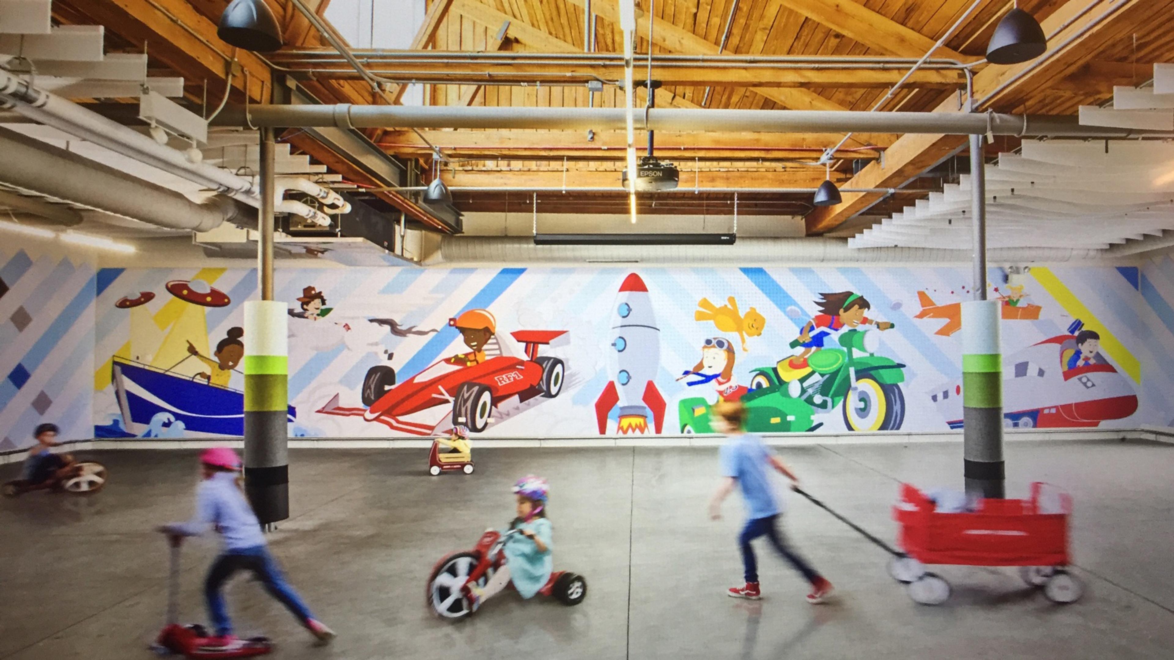 TURF used its printing capabilities to produce a 60’ long acoustic supergraphic to transform RadioFlyer’s “Playlab” test track. The flanking walls of the supergraphic have color-matched carved tiles that continue the geometry of the supergraphic but with the added texture of 3D tiles. Installed above the Playlab are both custom and standard torrent baffles that simulate the feeling of cirrus clouds and of being outside.